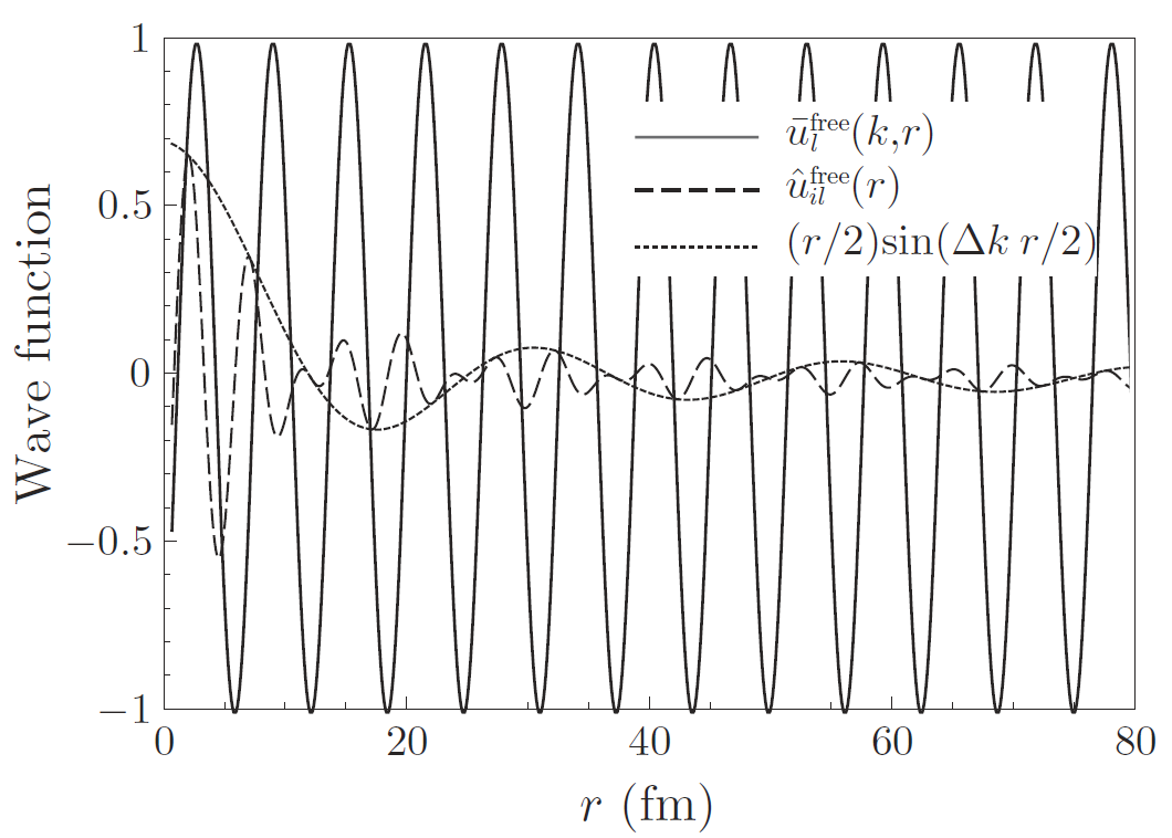 右辺で用いられている球ベッセル関数の表式は、引数が十分大きいところで成立するものですが、ここでは、全ての \( r \) についてこの表式を用いて計算しています。したがって、図10.4 にプロットされている結果は、\( r \) が小さいところでは正しい自由部分波(およびそれを波数について束ねたもの)にはなっていません。