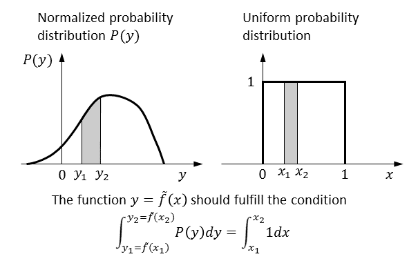 - A random variable $y$ filling in a given normalized probability distribution $P(y)$ can be calculated from an uniform random variable $x$ ($0<x<1$). The function $\tilde{f}(x)$ to transform $x$ to $y$ is described as \begin{align} y&=\tilde{f}(x)=F^{-1}(x),\\ F(y)&=\int_{-\infty}^y P(t)dt, \end{align} where $F^{-1}(x)$ is an inverse function of $F(y)$.