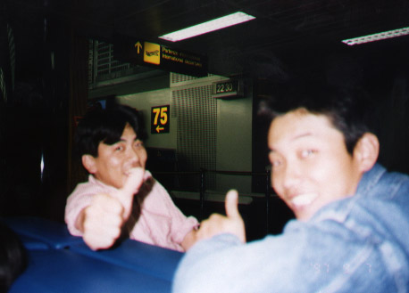 - ミラノの空港で野宿してるときの様子。夜も更けてハイになってるころ。(隣は一緒になった