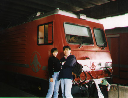 - ツエルマットの駅で記念写真。氷河特急の到着直後