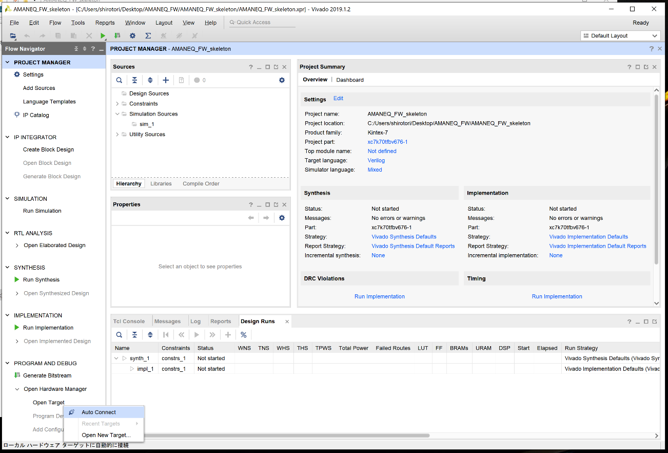 5. 繋がると”Hardware”が表示される。Xilinxのダウンロードケーブルのランプがグリーンになる。繋がらない場合はエラーメッセージが出る。(繋がらない時はケーブルがちゃんとささってない場合やUSBダウンロードケーブルが認識されていないなど)