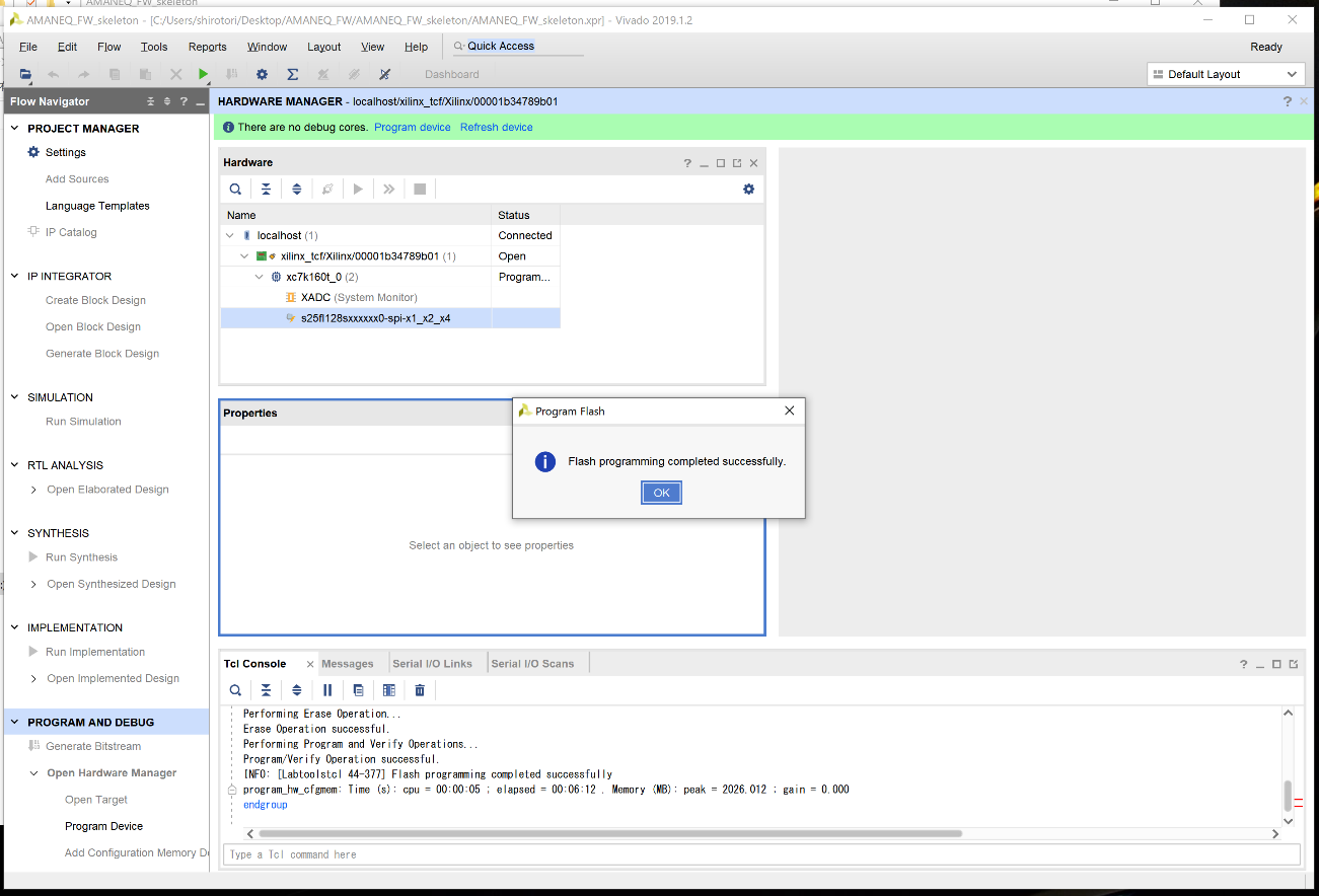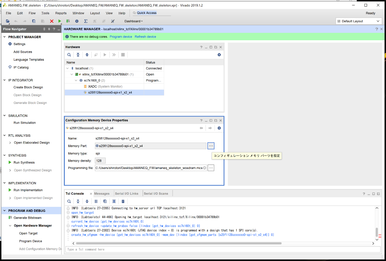 4. flash_memory_programmer を用いて mcs ファイルを書き込む。具体的には、このディレクトリに移動してから、以下のようなコマンドを打つ。<path to mcs file directory>/amaneq-4-strlrtdc-v2.5.mcs
