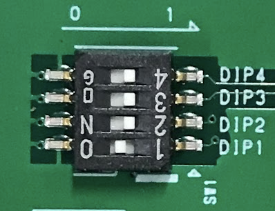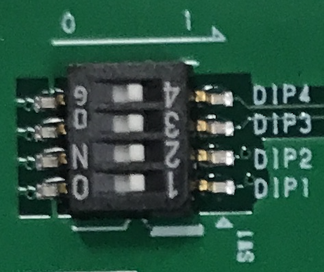 DIP スイッチは 下図のように DIP1: 0 (ON), DIP2: 1 (OFF), DIP3: 1 (OFF), DIP4: 1 (OFF)としたが、あまり関係ない?(要確認)