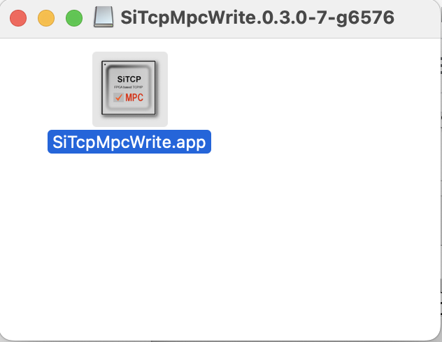 さらに、 SiTCP Utility を起動。SiTCPMpcWritter の起動と同様に、SiTCPUtility.macosx.0.7.4.dmg をダブルクリックすると、以下の画面がでる。ここで、SiTCPUtility.app 上で右クリックし、Open を選ぶと、SiTCPUtility.app が起動する。