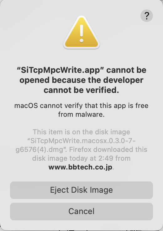 AMANEQと PC の接続が確認できたら、MCF Writter を起動。Downloadディレクトリ内のSiTcpMpcWrite.macosx.0.3.0-7-g6576.dmgをダブルクリックすると、以下の左図のように中身が開かれる。つぎにSiTCPWrite.app を実行する。ただ、単にSiTCPWrite.appをダブルクリックすると、以下の右図のように表示され開けない。