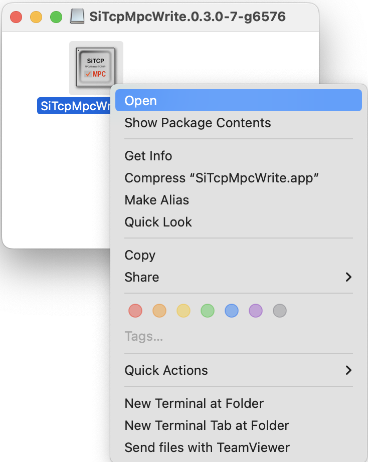 そのため、SiTCPWrite.appで右クリックし、メニューを表示させ、Open を選択。