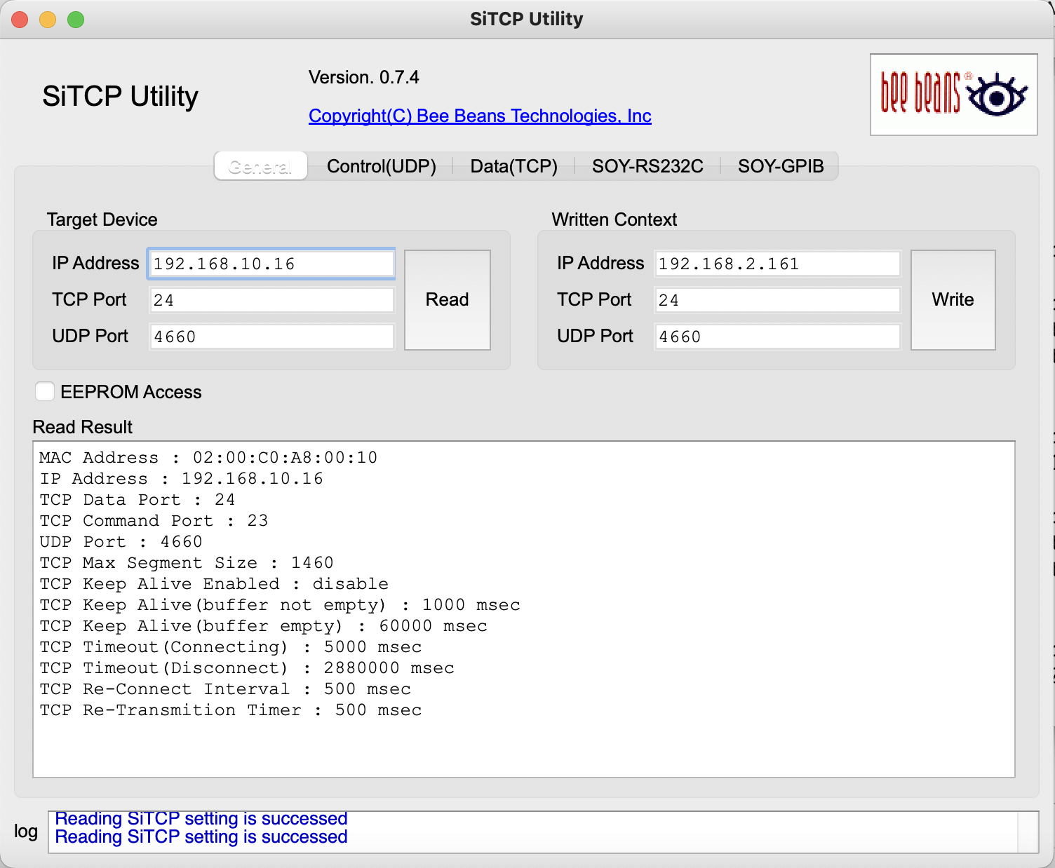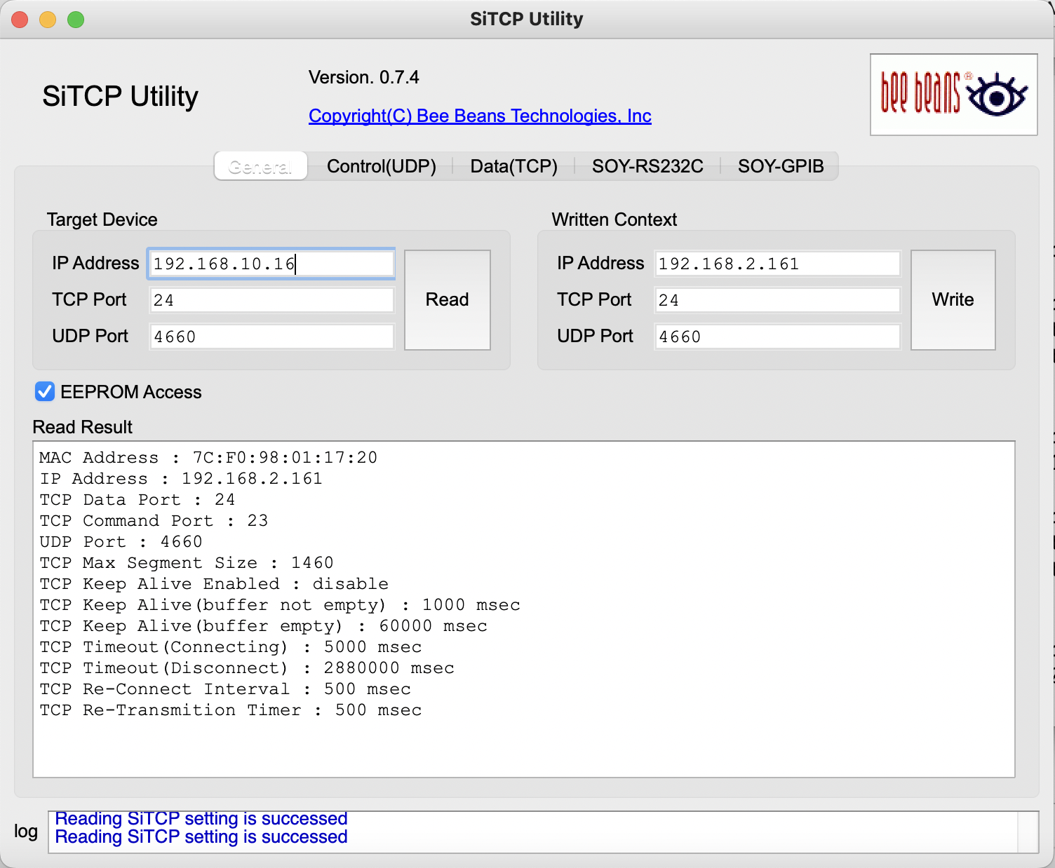 EEPROM Access をチェックし、Write ボタンを押して IP address (ここでは 192.168.2.161) を書き込む。これで電源が消えても不揮発性メモリに情報が残っている。ちなみに、新しい IPアドレスのネットワークアドレスは 192.168.2.0 であり、サブネットマスクは 255.255.255.0となる。これで Read すると、以下のように情報が変わっている。