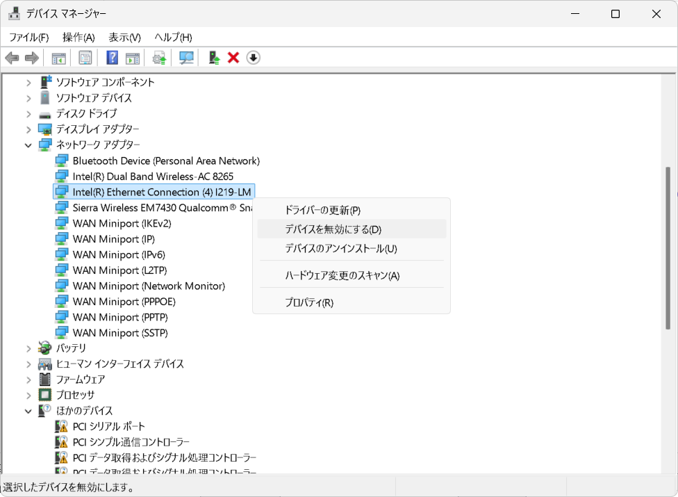Terminalで $ ifconfig コマンドを打ち、自身の IP address (inet) が 192.168.10.101 になっていることを確認。さらに、 $ ping 192.168.10.16 と打つと、AMANEQ から PING が返ってくる。ここで、ネットワーク設定、もしくはコンピュータによっては、PING が通らないことがままある。PING が通らない時の原因として、ネットワークケーブルの断線、IPアドレスの重複など単純な理由も考えられるが、わかりにくい原因の一つは、AMANEQ 側の SiTCP がネットワーク接続の Auto Negotiation に対応していないため、自動で通信速度が設定されず、物理層のリンクアップが成り立たないことがあげられる。(物理層についてはOSI基本参照モデルを参照のこと。知らない場合は Google 検索もしくは ChatGPT に聞く。)このような場合、ネットワークデバイスの再起動が有効な場合がある。一例ではあるが、Panasonic Lets’Note CF-SV7 の Windows 11 上では、単に LAN ケーブルを接続してもリンクアップしなかったが (No connection となる)、以下の画像のように、デバイスマネージャーのネットワークアダプターから、"デバイスを無効にする" をクリックしてから、"デバイスを有効にする"をクリックすると、リンクアップし、ネットワークの status が No Connection から No Internet に変わることがある。
