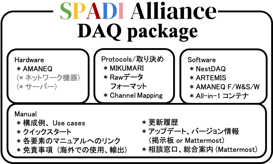 このSPADI Alliance DAQ パッケージは、SPADI Alliance (SPADI-A) の Working Group (WG) 7 が中心となってまとめた DAQ システムを構成するために必要な要素を含む一揃えのパッケージである。本DAQシステムは従来型のトリガー型DAQではなく、連続読み出し型DAQに対応したシステムである。連続読み出し型DAQは、場合によってはトリガーレスDAQ、デッドタイムレス DAQ とも呼ばれるが、近年盛んに研究が進んでおり、実装される事例が増えてきている。本パッケージは SPADI-A の WG1 - WG6 の最新の成果をまとめ、ユーザーが導入・利用しやすいようにしたものである。現時点 (2024年8月) ではこのパッケージの構成要素は、下図に示すようにハードウェア、プロトコル、ソフトウェア、ドキュメントに大きく分けられる。