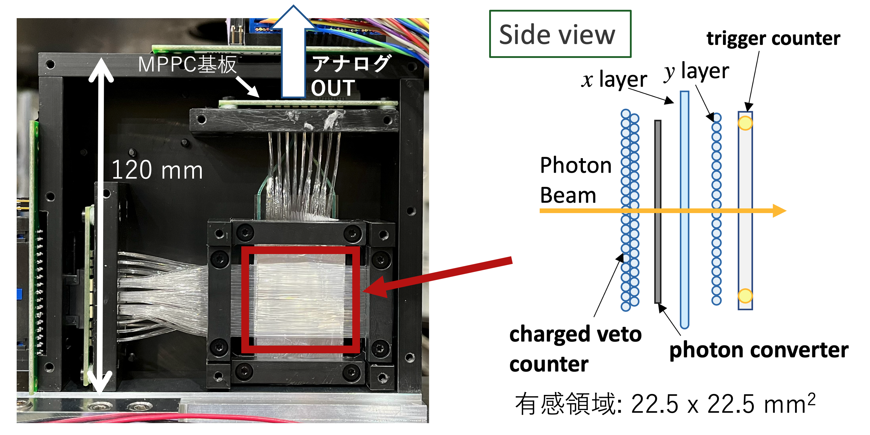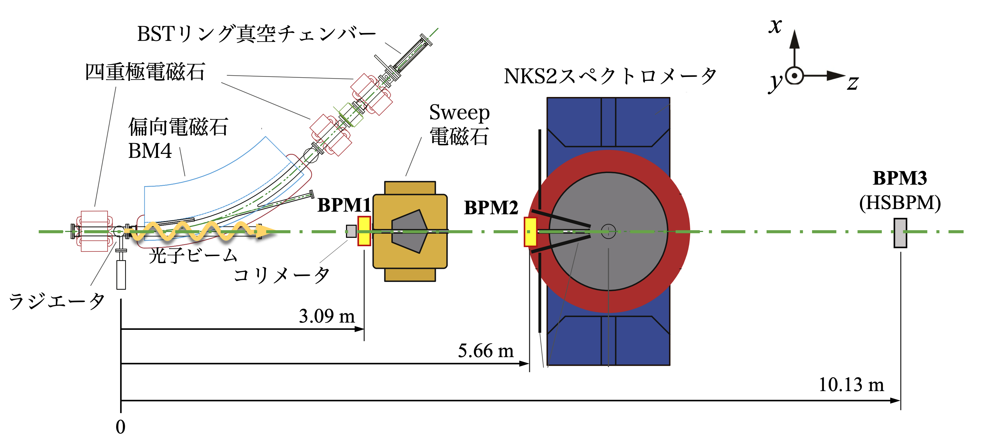 図1に実験を行なった第二実験室BM4ビームラインの模式図、図2にBPMの内部写真と検出部分の模式図を示す。Sweep電磁石上流側にBPM1、NKS2スペクトロメータ入口にBPM2、ビームライン最下流にBPM3(旧HSBPM[3])を設置した。BPMは、荷電粒子VETO層(1 ch)、電子陽電子コンバーター層、x-y位置検出層(15+15=30 ch)、トリガー層(1 ch)の計32 chから成るコンパクトな検出器である。特にBPM1, 2のx-y位置検出層は直径0.5 mmのシンチレーションファイバーから成り、1秒間のデータ収集で約10 µmの位置精度で光子ビームプロファイルを行う。これら検出器は既設であり利用実績がある。