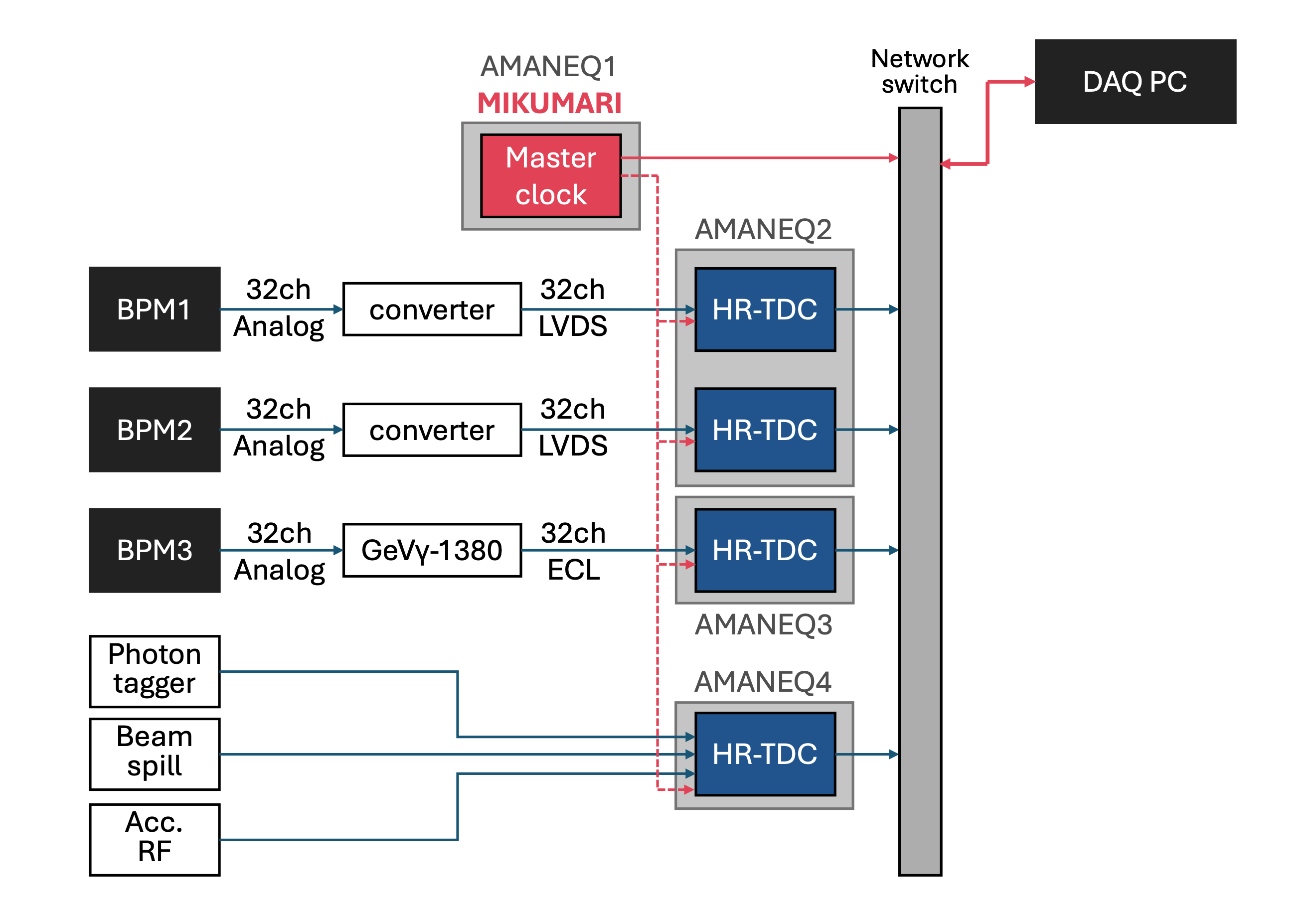 そこで、本課題ではBPM用DAQとしてストリーミング専用DAQモジュールである「AMANEQ」を導入することで既存の問題点を解消し、標識化光子ビームの即時測定を実現することを目的とする。