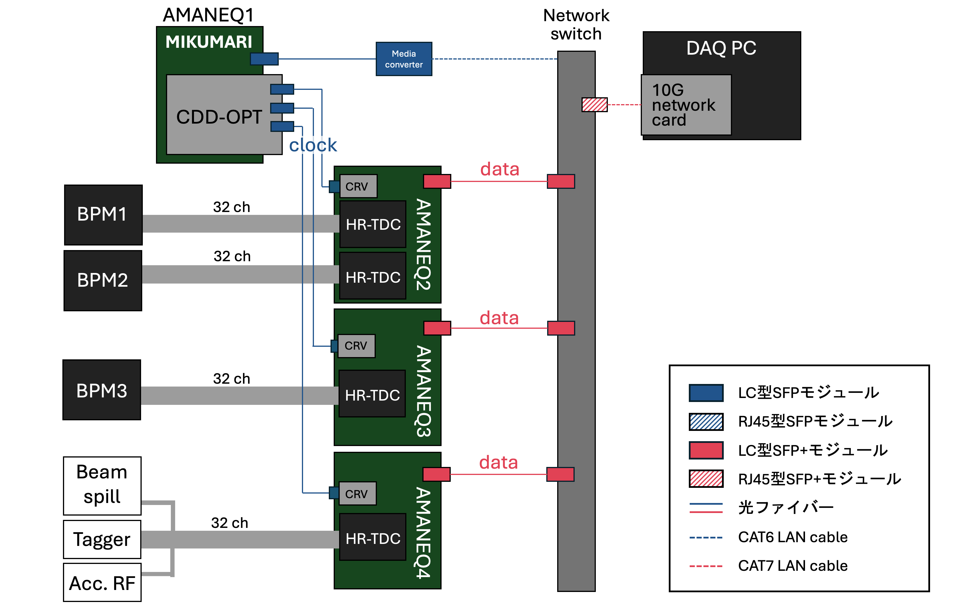 4台のAMANEQのうち、1台にはMIKUMARI clock primaryをダウンロードし(AMANEQ1)、他3台(AMANEQ2-4)にはHR-TDC BASEをダウンロードした。図4にシステムの構成と配線図を示す。青のボックスとラインは1Gbps、ピンクのボックスとラインは10Gbpsに対応している。LC型とRJ45型(メタル)は用いるケーブルの形状に合わせて選べば良いが、1Gbpsと10Gbpsは明確に区別する必要がある。MIKUMARIの制御ラインとMIKUMARIから配られる同期クロックラインは1Gbps、HR-TDCからのデータ転送ラインは10Gbpsにする。本実験ではMIKUMARIとハブ間に必要なSFPモジュールとケーブルの組み合わせの辻褄を合わせるためRJ45-LCのメディアコンバータを挟んでいるが、本来は必要がない。